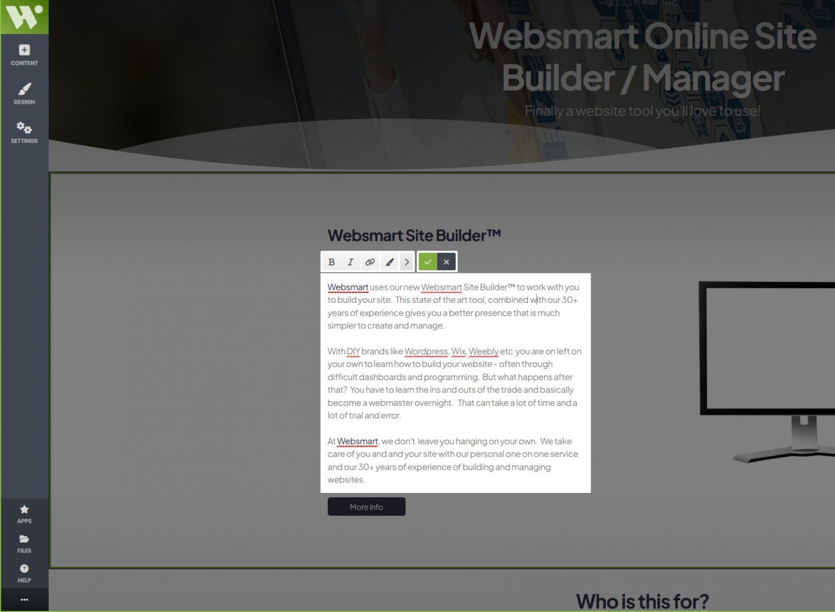 There are many different pieces that come together to make a website, it doesn't matter what software or service you use. Websmart makes running a website easier for you by putting all those pieces together.